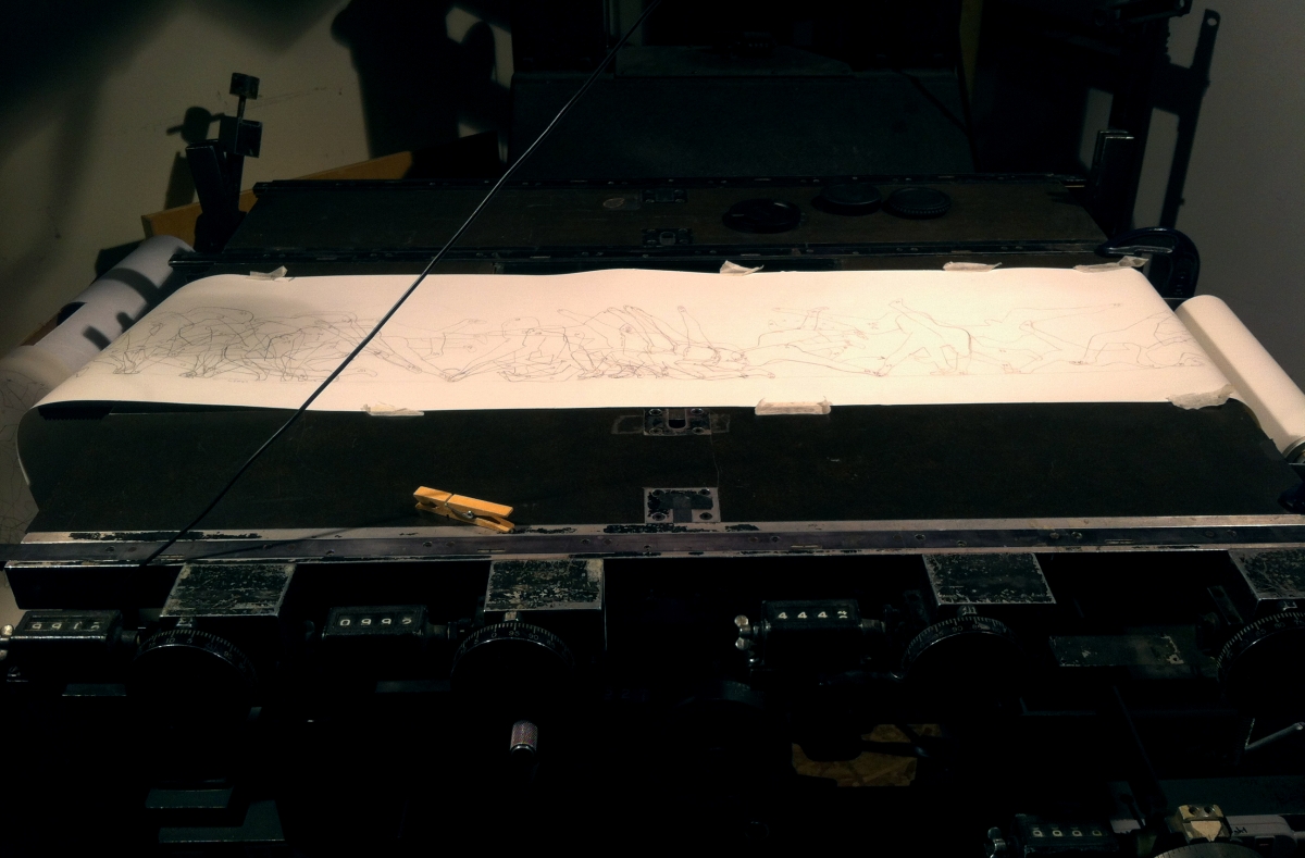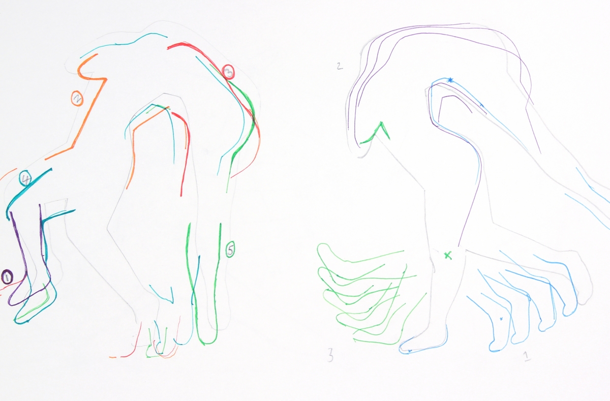 Perhaps it inherits the language of Andy Warhol’s dance diagram paintings, which sidestepped the existential despair of thwarted masculine subjectivity. At this particular historical moment, in any case, reference to the mechanized body no longer carries the same disturbing associations it once did. Robots, the revivified flesh of the Frankenstein monster, industrial machinery, the dystopian choreography of Metropolis; these once nightmarish images seem almost quaint now, distant from contemporary scenarios of social control, characterized by the permeability of the parasite-ridden subject. The conventions of dance notation, codified in the early 20th century by the Russian ballet at a time when the industrialization of the body was a pressing issue, now seem likely a purely aesthetic construct. And as presented in This is the way they make us bend, their materiality signifies a kind of resistance to old narratives, or at least an allegorical relationship to them.