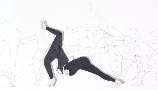 A flat, headless, three-limbed being lurches along a horizontal track – a choreographic score – for just over three minutes. The score runs the body through a series of rotating motions defined by the shapes of the cutout forms, the positions of their points of attachment and rotation, the edges of numbered contours. This linear two-dimensional movement is accompanied by a soundtrack of squeaks, scrapes and shuffles that accentuate the rhythm of the body’s travels along the score and its mechanical armature. During the course of the piece, the paper doll-like figure explores the limited range of possibilities afforded to it; obviously these can’t even begin to capture the wide and complex range of movement of an actual body.