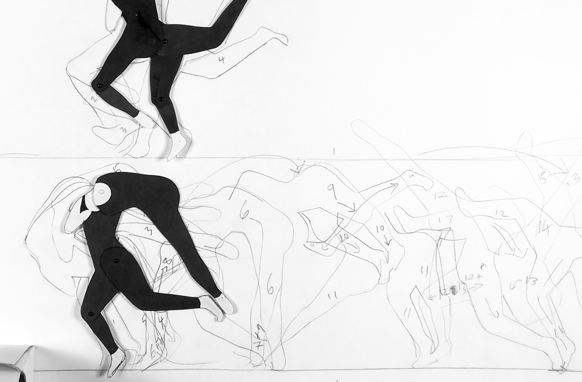 The spinning creature, after all, has “personality.” As we follow its awkward movements, we begin even to empathize with it. Body language is sometimes said to reveal more of a person’s character than facial expression. We are witnessing a moment when the body language of choreographic notation spins on its own axis, wakes up and starts moving, detaches from the ground of iconic description and begins to stake out a world, where real things happen that no longer represent anything. Escaping the condition of a sign, with its arbitrary relationship to body and gesture, the tension and release of the paper figure’s journey outlines an autonomous being. Its dance is stiff and jerky, but it is also light, a mere traced overlay upon the dense, sinuous bodies that are implied, and an open-ended sort of discipline, a regime of quickened, floating repetition and exchange.